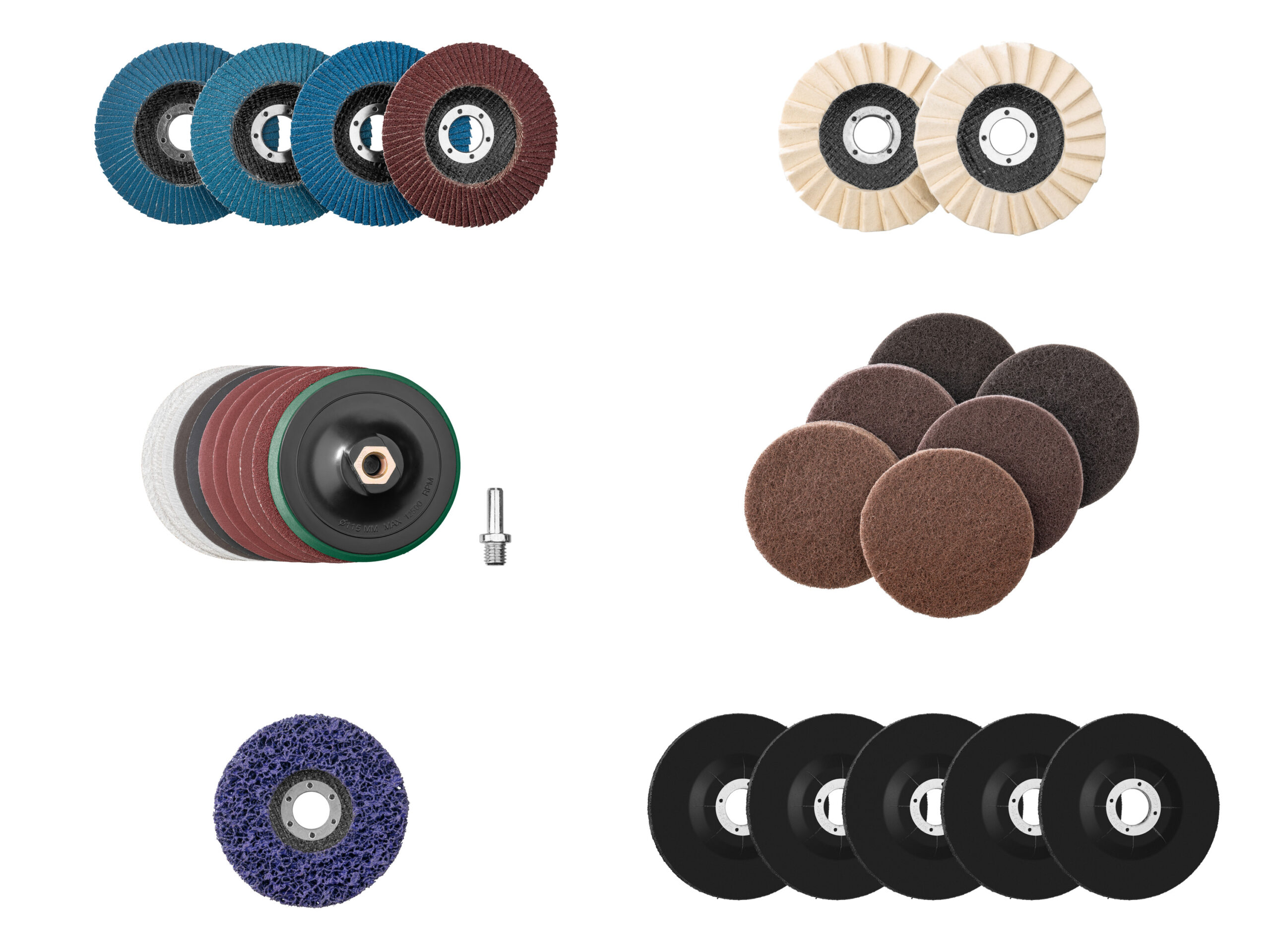 - Set de disques à ébarber : Pour le ponçage des surfaces et des bords du métal; idéal également pour les soudures. Épaisseur des disques : 6 mm (5 pièces). Vitesse de rotation maximale : 13300 tr/min.