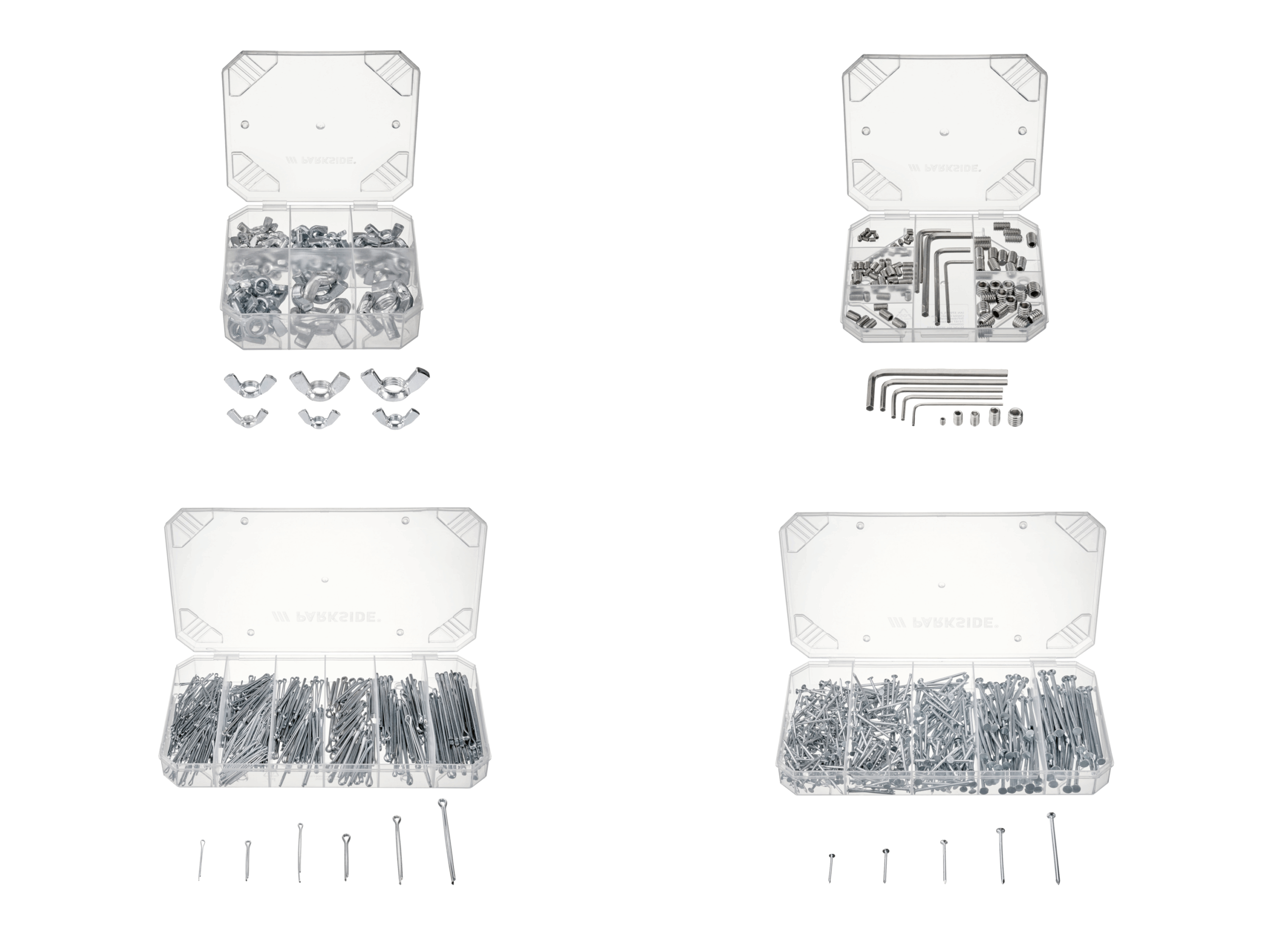 Kit de visserie complet PARKSIDE® : écrous papillons, vis sans tête, goupilles et clous. Boîte de rangement pratique, idéal pour tous vos travaux de fixation.