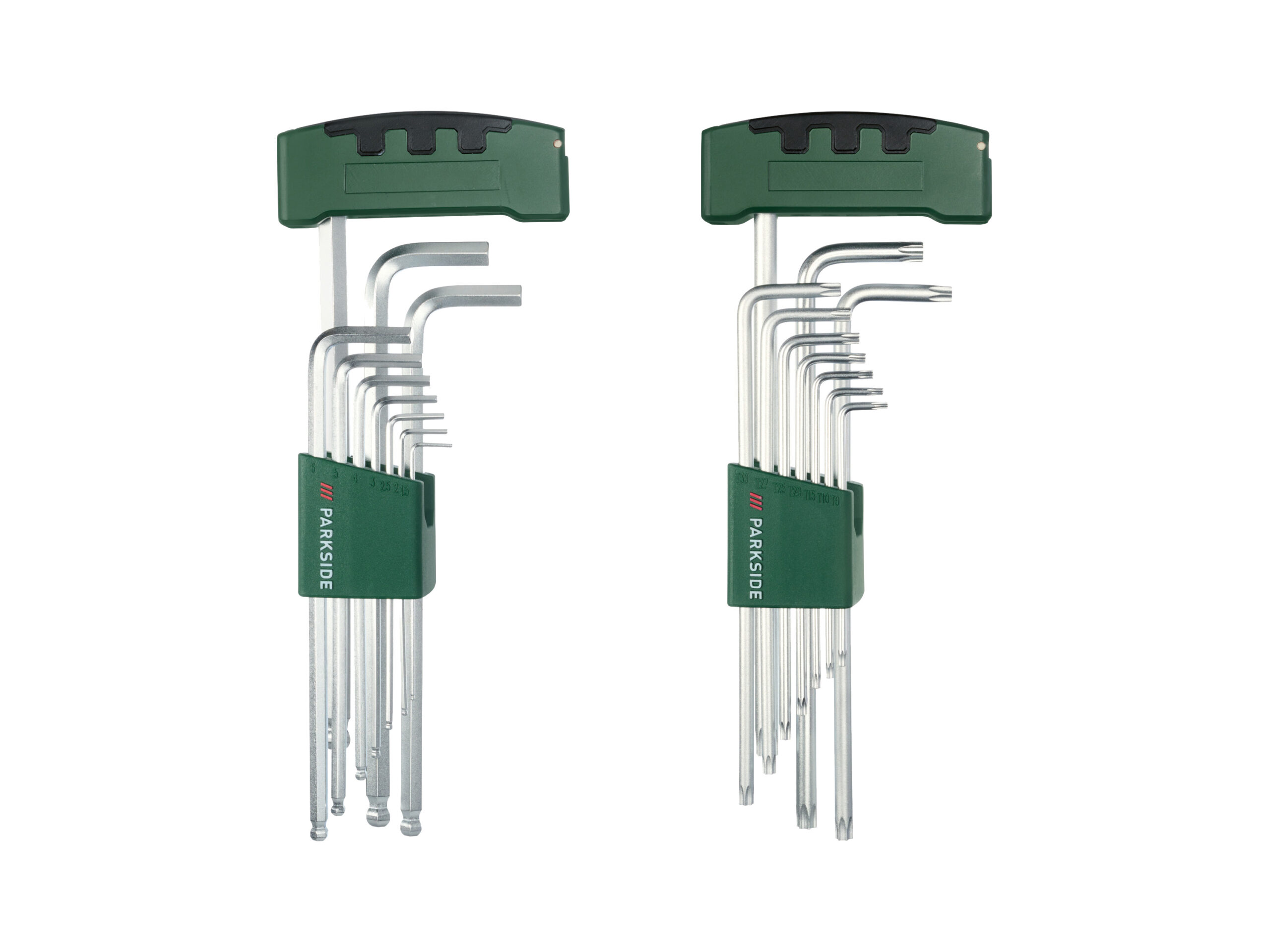 Jeu de clés mâles coudées PARKSIDE® avec embouts Torx et six pans. Support pliable, embouts en T pour couple élevé et têtes sphériques pour accès difficile.