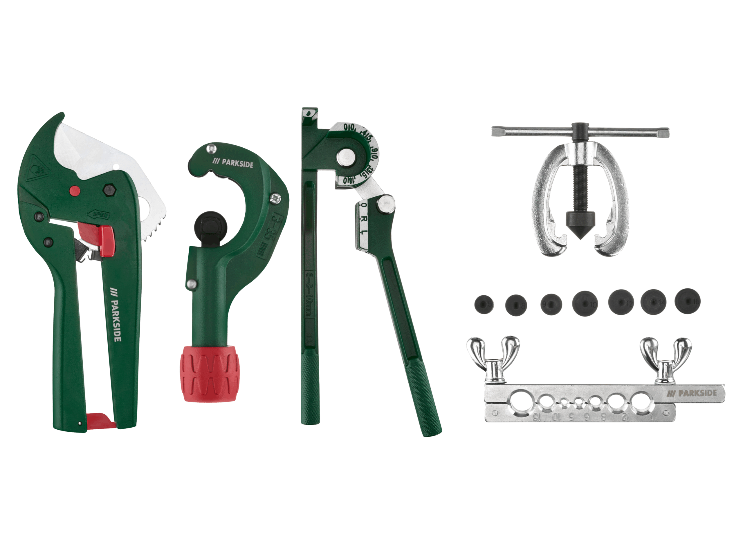 Kit complet PARKSIDE® pour couper, cintrer et sertir tubes en métal et plastique. Coupe-tube, pince à cintrer, outils de sertissage inclus. Qualité professionnelle.