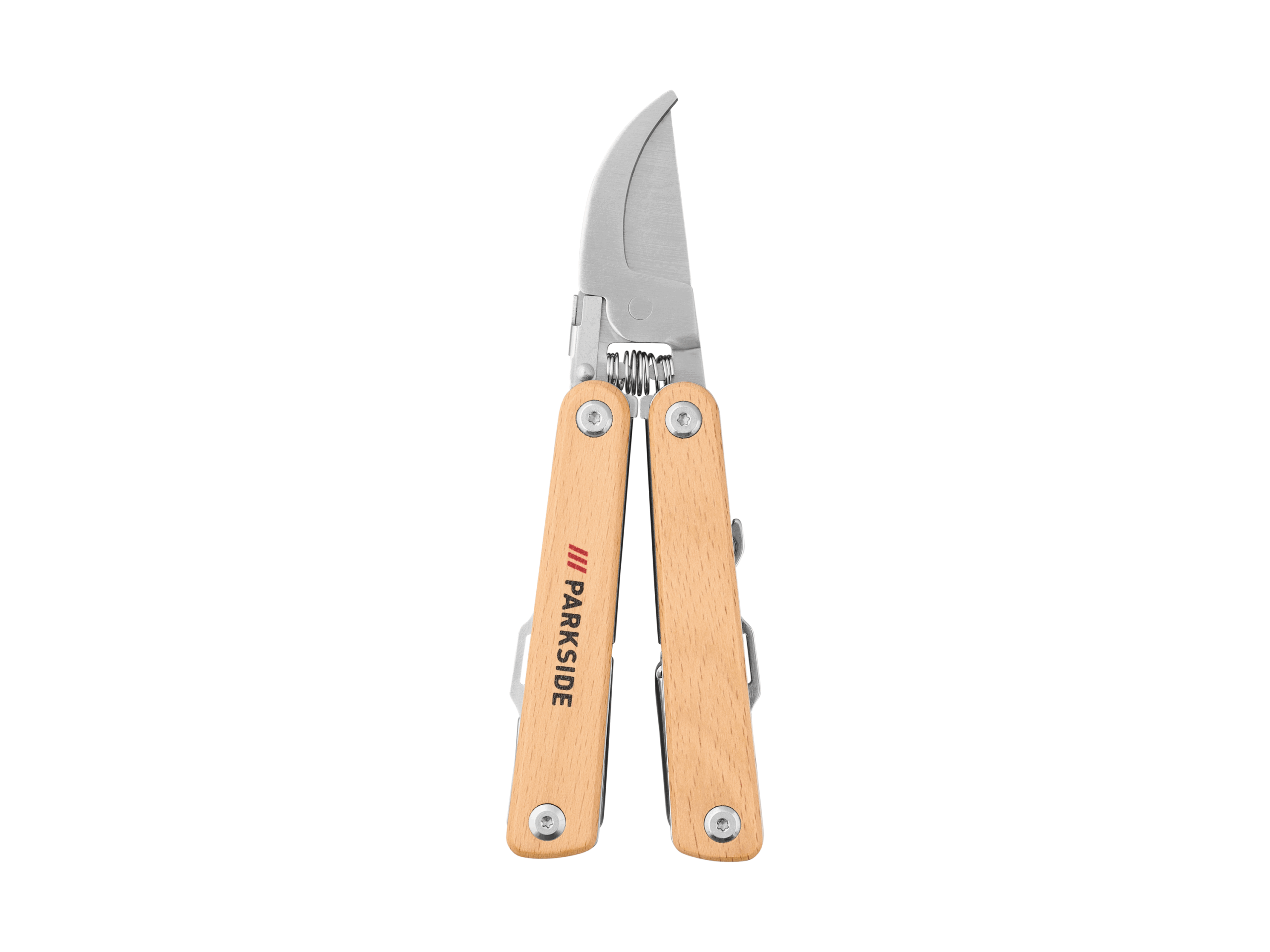 L’outil multifonction PARKSIDE® 7-en-1 : sécateur, scie, lime et plus. Idéal pour la taille et l’entretien de votre jardin. Poignée en bois de hêtre.