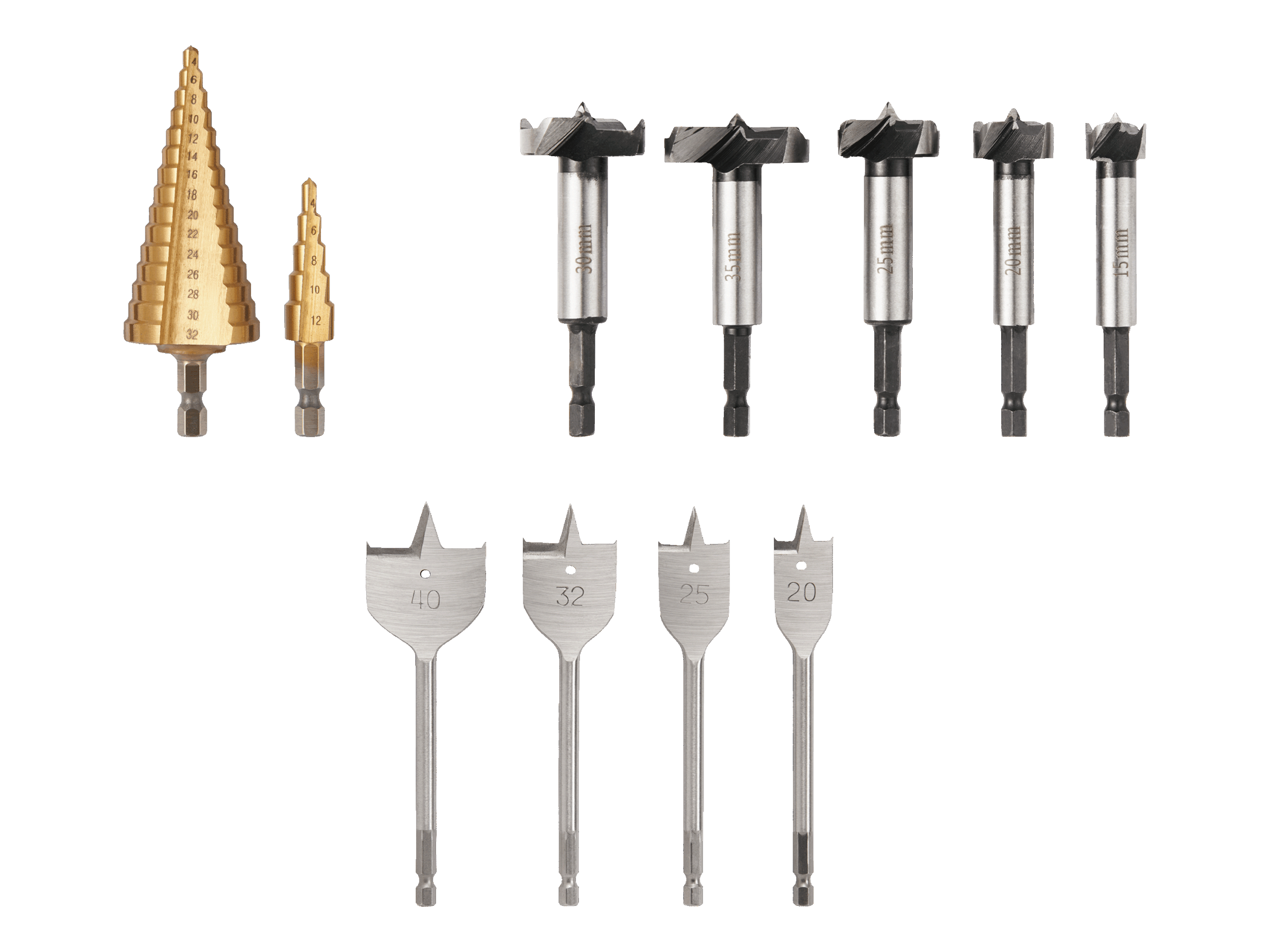 Set complet PARKSIDE® PSB 3 A1 pour percer bois et métal avec précision. Compatible visseuses sans fil, embout hexagonal. Inclut forets étagés, Forstner et mèches plates.