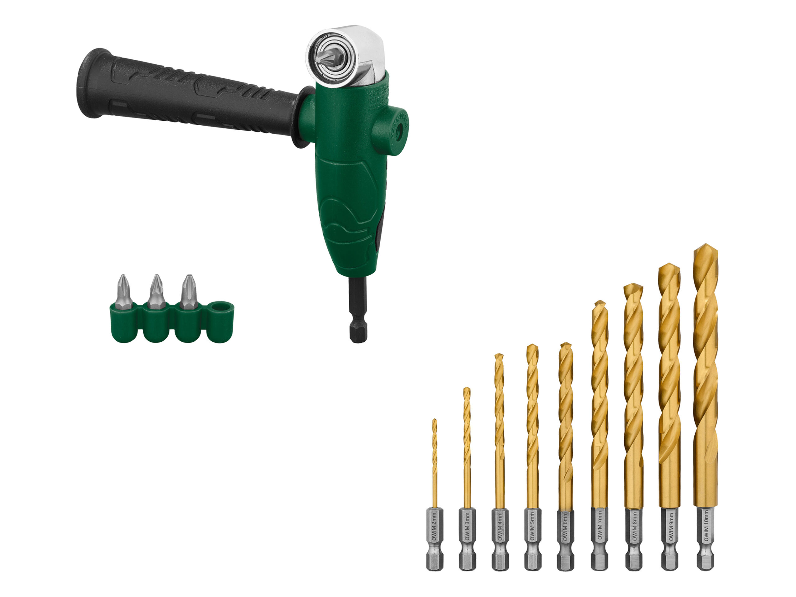 Kit PARKSIDE® : Renvoi d’angle pour perceuse (idéal espaces restreints) + forets HSS titane (robustesse & précision). Compatible toutes perceuses/visseuses.