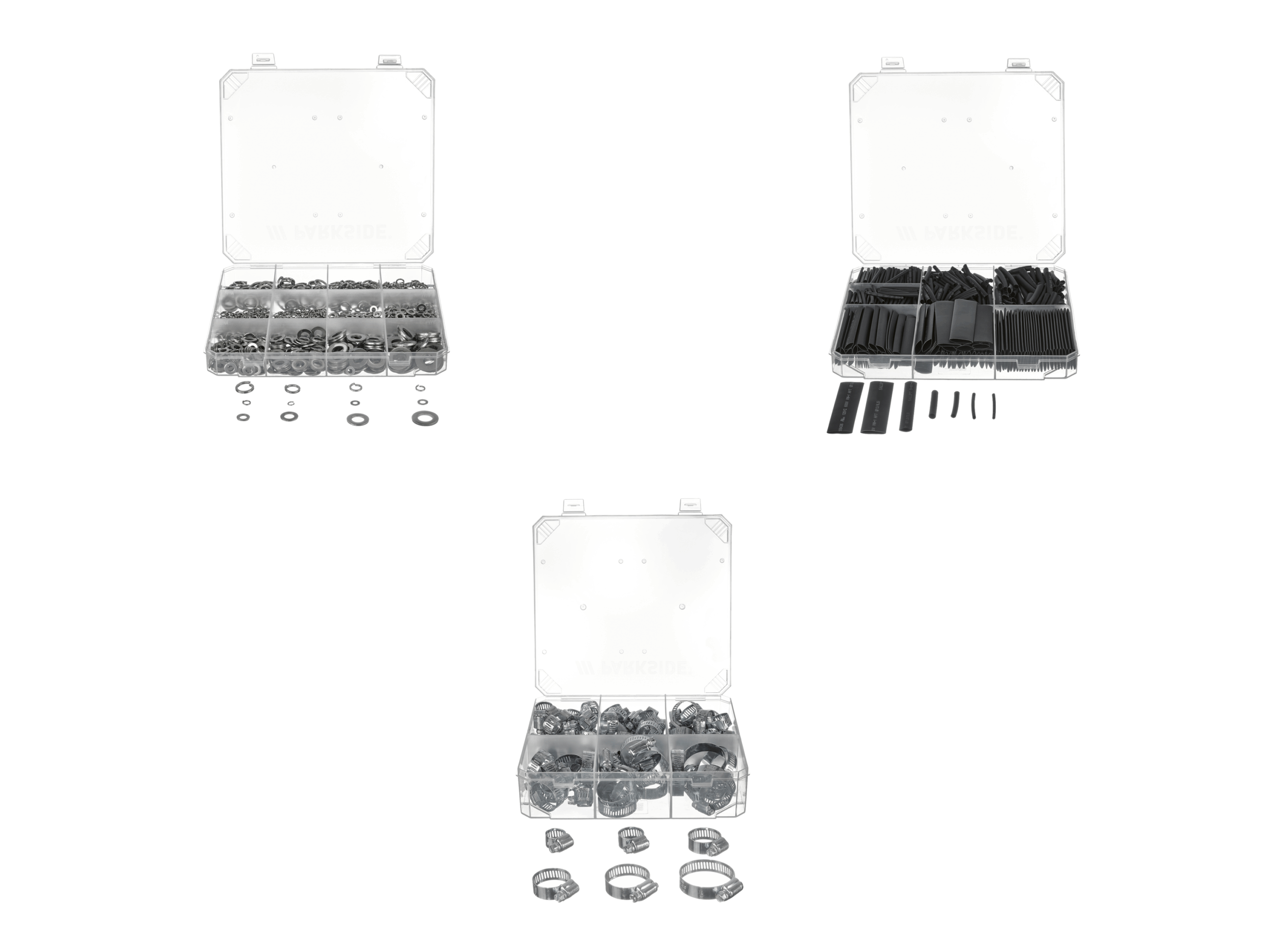 Assortiment complet PARKSIDE® : rondelles, gaines thermorétractables et colliers de serrage, rangés dans une boîte transparente pratique pour tous vos besoins !