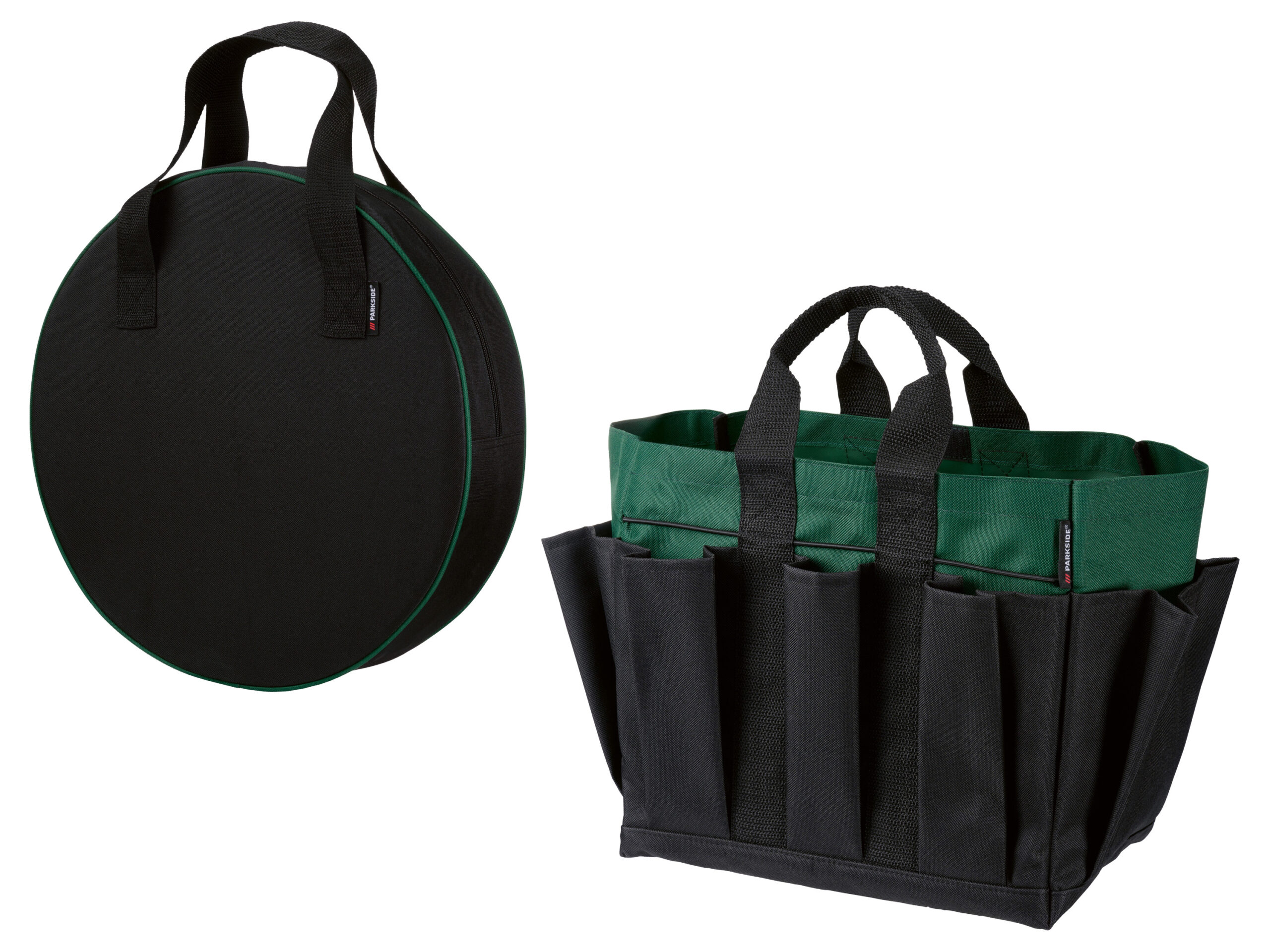 Organisez votre jardinage avec le sac à outils et la sacoche pour tuyau Parkside®. Robustes, pratiques et éco-responsables ! Transport et rangement faciles.