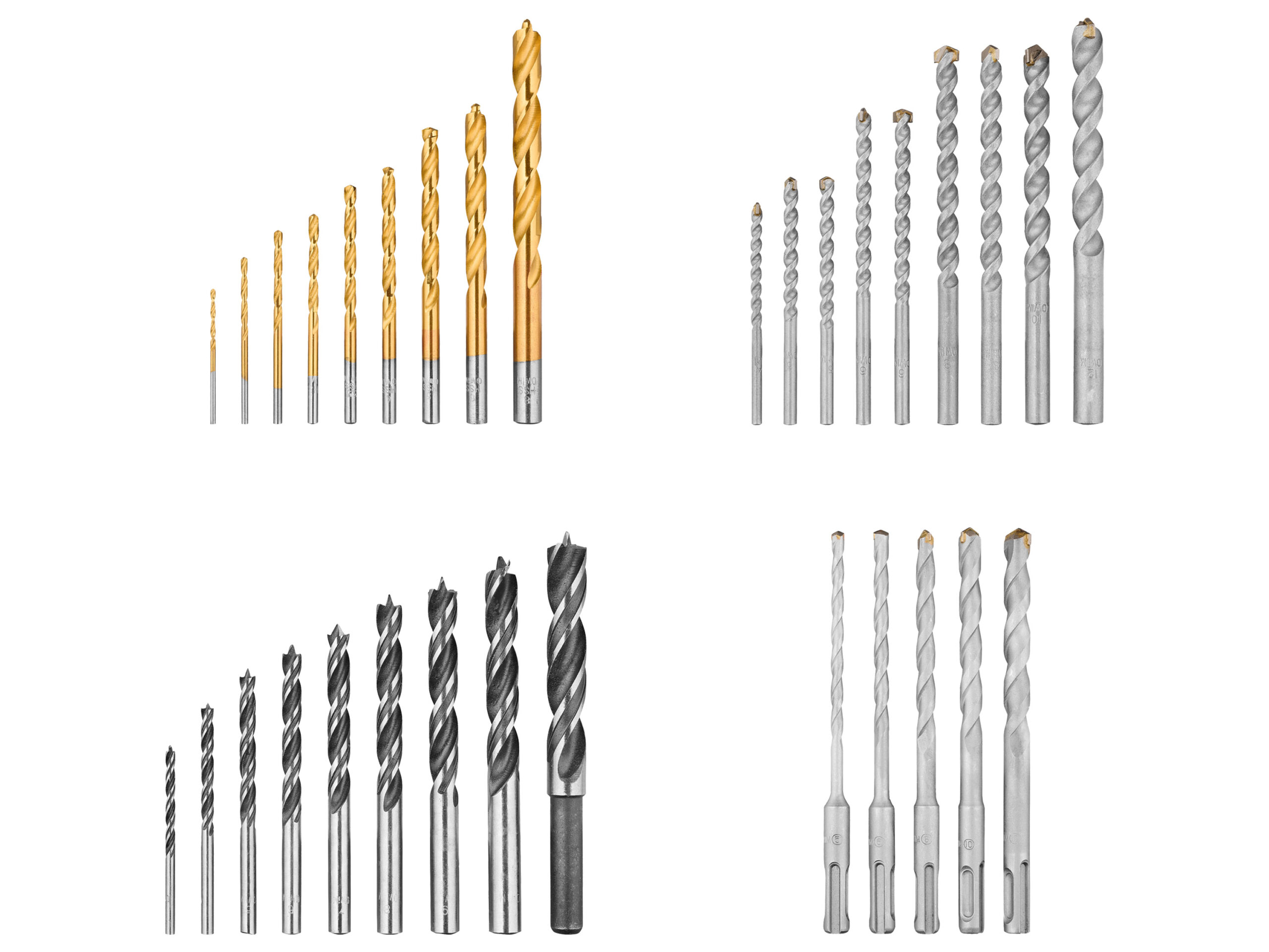 - Forets SDS : En acier au carbone avec pointes en carbure et embout SDS-plus pour percer la pierre, la brique et le béton léger.