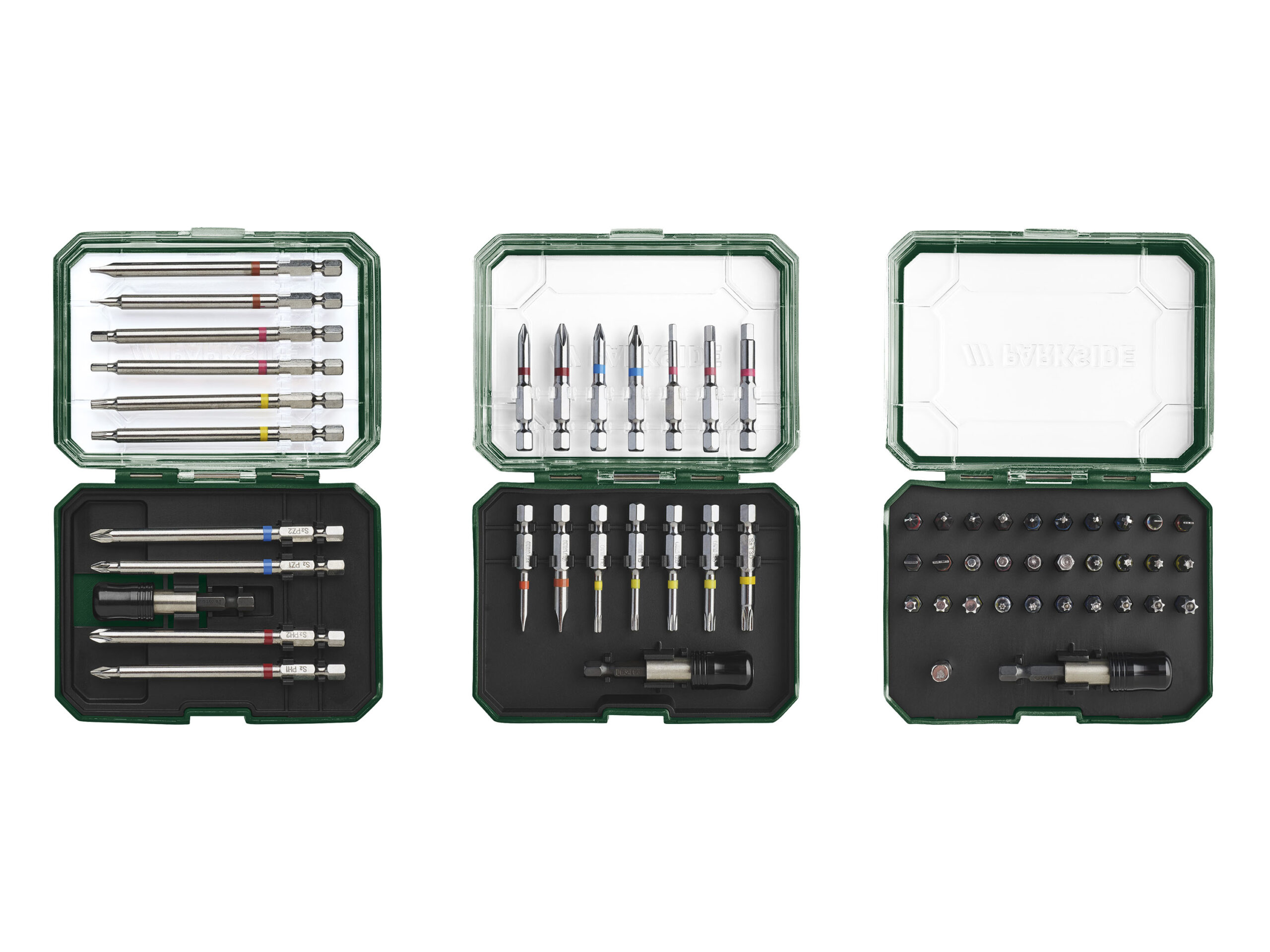 Set d’embouts PARKSIDE® PBS 3 C3 : Jeu complet d’embouts de vissage pour tous vos travaux. Acier trempé, porte-embout rapide et boite de rangement inclus.