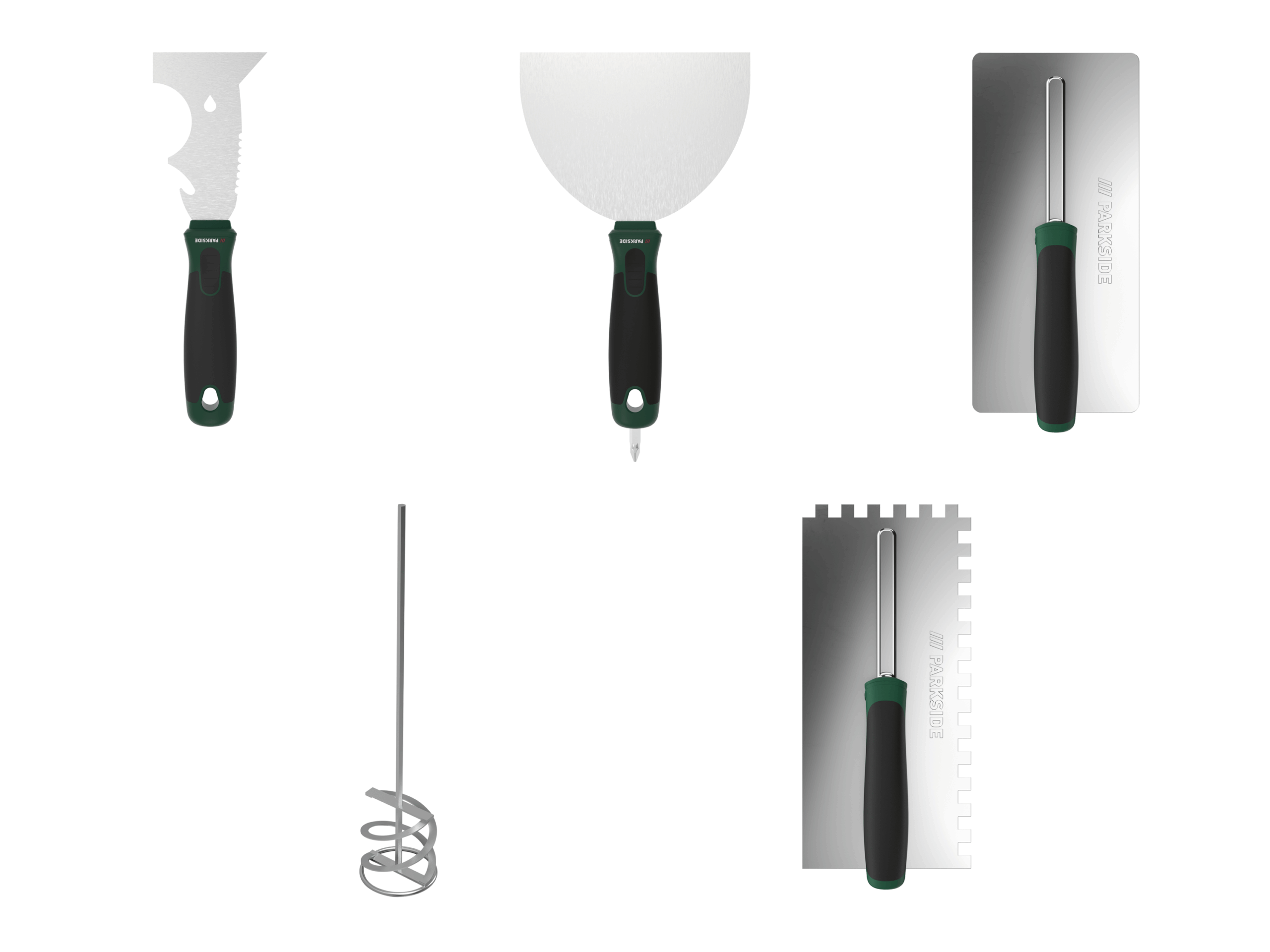 Kit complet PARKSIDE® pour plâtrer, lisser et mélanger ! Spatules, platoirs, mélangeur robustes et inoxydables. Poignée ergonomique pour un confort optimal.